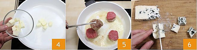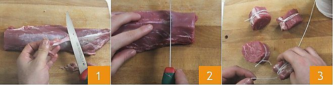 To prepare the filet mignon with Roquefort sauce, take the fillet, clean it, trim the fat 1, and cut it into slices about 2 inches thick 2. Now tie each slice with white kitchen string: make two loops and secure the string with a double knot, cutting off the excess parts 3.