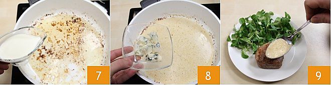 In the same pan, add the cream 7 and the cheese 8; stir and continue cooking until the Roquefort has melted completely and you have obtained a creamy consistency. You are ready to plate: place a fillet on each plate, carefully removing the string, drizzle it with the sauce, and accompany it with fresh lamb's lettuce 9. The filet mignon with Roquefort sauce is ready, we recommend serving it still hot.