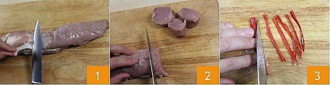 To prepare the honey and ginger pork tenderloin, start by removing the excess fat from the tenderloin 1 and cut it into chunks about 3/4 inch thick 2; if you don't like pork, you can replace it with chicken or turkey breast. Salt the pork chunks but not too much because the soy sauce will add savoriness. Cut the fresh chili pepper into julienne 3, if you prefer, you can remove the seeds first to reduce the spiciness.