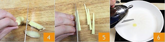 Peel the ginger 4 and cut it into julienne 5. Heat two tablespoons of sesame seed oil in a pan 6, alternatively, you can use another seed oil like sunflower or peanut oil.