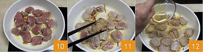 Pour the julienned ginger into the pan first 7. After a couple of minutes, add the chili pepper 8. Flavor the oil and place the pork tenderloins using kitchen tongs 9.