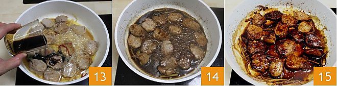 Cook over medium-high heat to brown the chunks well 10 on both sides, the outside should be well golden 11. After about 4 minutes, pour the honey 12