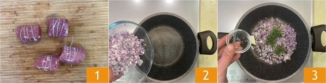 To prepare the pork tenderloin with red wine sauce, start by tying the tenderloins with kitchen twine, so they retain their shape while cooking 1. Begin preparing the wine sauce: pour chopped shallots 2 into a saucepan with herbs, garlic, and peppercorns 3.