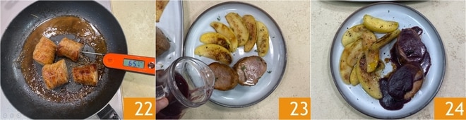Avoid stirring but turn them with tongs 16. Once the apples are cooked, remove and keep them warm 17. In the same pan, place the tenderloins that you tied earlier 18.