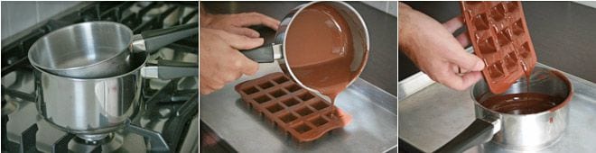 Once completely melted, fill silicone molds with the melted chocolate and then remove it from the mold so only a thin layer remains on the walls: then put the molds in the fridge to let the chocolate harden.