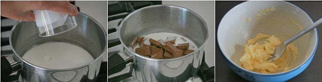 Melt 7 oz of dark chocolate in a bain-marie: break the chocolate into pieces, place it in a smaller saucepan over a larger one containing 3-4 inches of boiling water; the saucepan with the chocolate should never touch the water directly. The chocolate will slowly melt thanks to the heat from the steam.
