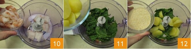 Once the potatoes are cooked, let them cool, then peel them. Now place in the mixer the cod, shrimp 10, well-washed and dried fresh spinach, add the potatoes 11 and breadcrumbs 12, salt and pepper.