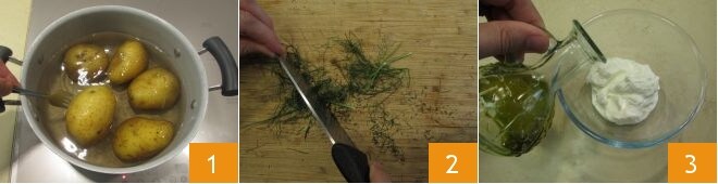 To prepare the fish cutlets with yogurt sauce, first boil the potatoes 1 for about 30 minutes or until they are soft (cooking time may vary depending on their size). Meanwhile, prepare the sauce: chop the fennel with a knife 2, and in a small bowl pour the yogurt and olive oil 3.