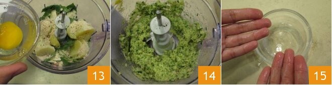 Finally, add the egg 13 and blend all the ingredients until you get a compact and homogeneous mixture 14. Now you can shape your cutlets: moisten your hands with a little water 15 to work the mixture better.
