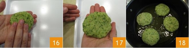 Take a portion of the mixture, give it a round shape and lightly flatten it 16 to obtain a cutlet, as you form them, place them on a tray 17. Once ready, place them to firm up in the freezer for 10 minutes. Finish with the cooking of the cutlets: heat 4 tablespoons of oil in a pan, take the firmed-up cutlets and cook them for 3 minutes on one side and 2 minutes on the other 18.