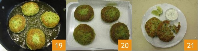When they have a nice golden color 19, drain them and transfer to a tray lined with absorbent paper 20. Serve the fish cutlets still hot accompanied with yogurt sauce 21.