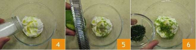 Salt 4, pepper, aromatize with lime zest 5 and chopped fennel 6.