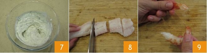Mix 7 to blend and keep in the fridge until ready to serve. Cut the already cleaned cod fillet into pieces 8 and then shell the shrimp 9 following our guide: How to clean shrimp. Once cleaned, you will get about 150 g (5.3 oz) of shrimp.