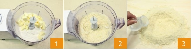 To prepare the fish pie, start with the Chicken pie: put the flour, cold butter from the fridge cut into pieces 1, a pinch of salt into the blender and blend everything until you get a sandy and floury mixture 2. At this point, place the obtained mixture on a pastry board in the classic fountain shape and knead everything quickly by adding cold water little by little 3 until you get a compact, firm, and fairly elastic dough.