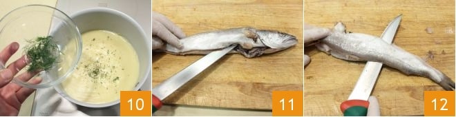 finally add dill, thyme, and pepper 10. Set the béchamel aside and take care of cleaning the hake: make a cut on the belly and proceed straight until under the head 11, then collect the innards with your hands and remove them. Wash the fish's belly well under running water to remove all traces of blood. Cut the fins with special scissors, with the fish filleting knife cut the head and remove it, then cut along the dorsal part of the fish along the spine 12, starting from the top, and proceed by moving the blade horizontally to the work surface,