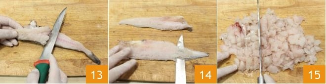 to separate the two fillets 13. Finally, detach the meat from the skin 14. Remove any bones with kitchen tweezers, then coarsely chop the hake 15.