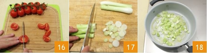 wash and cut the cherry tomatoes into wedges 16, wash and slice the spring onion 17 transfer it to a pan with a drizzle of oil 18 and sauté over moderate heat