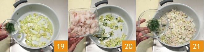 add dill and thyme 19 and then add the chopped hake 20, cook for 2 minutes then flavor the fish with thyme and dill 21,