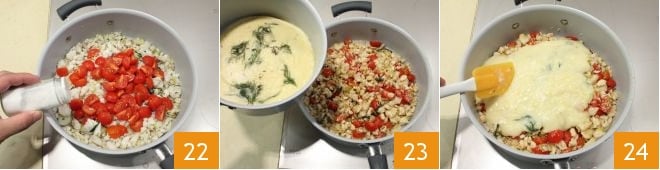 also add the cherry tomato wedges 22, salt, pepper and continue cooking for another 6 minutes, then turn off the heat and incorporate the sauce 23 mix with the spatula to blend it 24