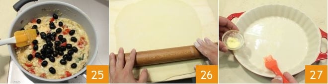 and then also add the black olives 25. Take the shortcrust pastry loaf, divide it into two equal parts (keep half of the pastry aside wrapping it with film), roll out the other half with a rolling pin into a round sheet 0.08–0.12 inches thick, about 11.81 inches wide 26, lightly flour the work surface to prevent the sheet from sticking. Butter a wavy-edged baking pan with a diameter of 10.63 inches 27.