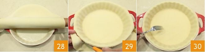 Roll the sheet onto the rolling pin and then unroll it onto the baking pan 28, adhere the dough to the bottom and its edges with a light pressure of your hands, cut off the excess dough along the entire perimeter of the baking tin 29, prick the bottom with the tines of a fork 30