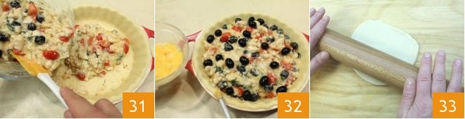 pour the hake filling into the mold 31 and brush the edges of the dough with the beaten egg 32, roll out the leftover dough into another sheet like the first 33,