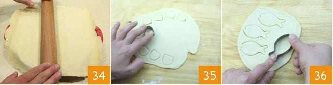 wrap it on the rolling pin and spread it over the baking tin, press on the edges with the rolling pin to adhere the sheet and remove the excess dough 34. With the leftover dough, make shapes with cookie cutters; we chose shells 35 and little fish 36,