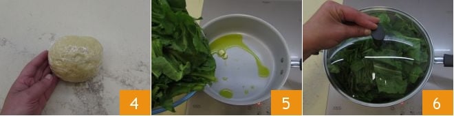 until you get a smooth and homogeneous dough, then wrap it in plastic wrap 4 and let it rest for about 30 min. Meanwhile, wash the herbs, place them in a pan with oil and garlic 5 and sauté; add salt and pepper, cover with a lid 6 and let cook for about 3-4 minutes.