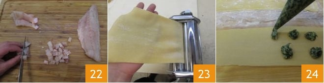 then cut it into cubes 22 and set aside. Now roll out the pasta with a pasta machine, proceeding from the smallest number to the desired thickness 23, then once rolled out, fill a piping bag with the filling and spread it gradually over the pasta 24,