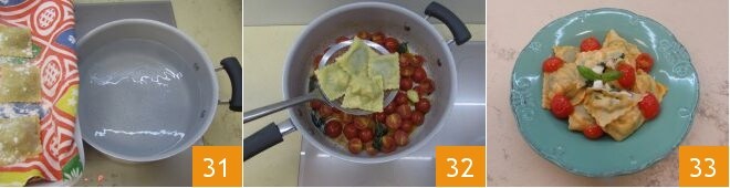 Cook the ravioli in salted water 31 and when they are cooked, transfer them gradually to the pan 32 and toss them with the sauce. Your fish ravioli with cherry tomatoes are ready to be served hot and enjoyed to the last bite 33!