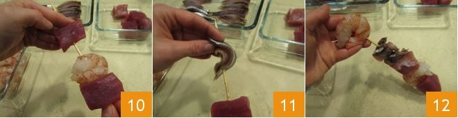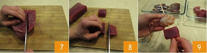 Take the tuna steak and cut it first into thick slices 7 and then into cubes 8, making 8 pieces. At this point, start assembling the skewers. Take a wooden skewer and thread a piece of tuna and a shrimp 9, letting them slide toward the end.