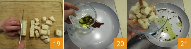 In the meantime, start preparing the crunchy panzanella, which you can serve as a side dish. Cut the slices of bread into cubes 19. Then, in a hot pan, pour the Worcestershire sauce and the oil 20. Add the bread cubes 21