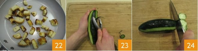 and toast them for a few minutes until they are golden brown 22. Set aside and move on to trimming the cucumber. Then, peel the outer skin in strips lengthwise only in some areas 23 and cut it into thin slices 24.