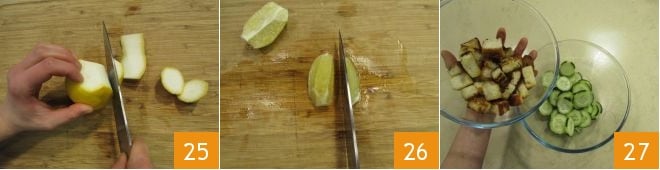 Take the lemon, peel it raw, taking care to remove all the white part 25; then separate the segments 26. Transfer the cucumber slices into a bowl, along with the pan-toasted bread 27.