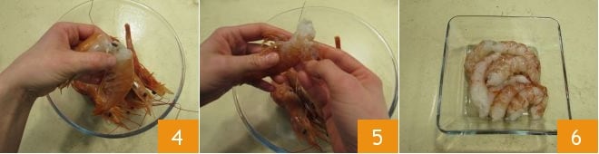 Then proceed to the How to clean shrimp: detach the head 4, remove the legs and gently pull away the shell 5. Using a toothpick, also remove the internal intestine; then set these aside 6.
