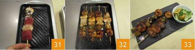 Proceed to cook the skewers: drain them from the marinade and place them on a hot grill 31. Wait about 3 minutes, then turn them and finish cooking for another 3 minutes 32. Serve your skewers still hot, accompanied by the crunchy panzanella 33.
