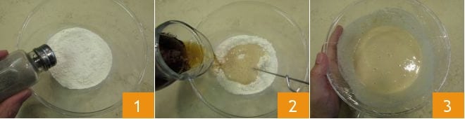 To make the fish tacos, first prepare the batter: sift the flour into a bowl, add a pinch of salt and pepper 1, then slowly pour in the beer 2 while whisking to achieve a smooth and homogeneous mixture. Cover with plastic wrap 3 and set the batter aside in the refrigerator.