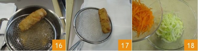 Once golden, drain them with a slotted spoon 16 and place on a tray lined with paper towels to absorb the excess oil 17. Meanwhile, in a bowl, combine the iceberg lettuce and well-drained and dried julienned carrots 18.