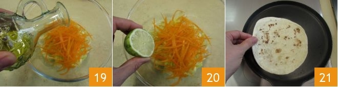 Season with salt, oil 19, and lime juice 20. Heat the tortillas one at a time in a large, hot pan 21.