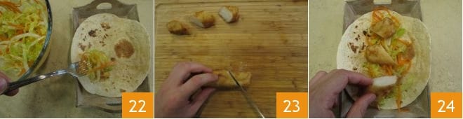 You're ready to fill the tacos: first lay down the iceberg and carrot salad 22, then cut the cod sticks diagonally to make bite-sized pieces 23 and add them to the taco 24.
