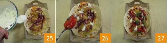 Continue with strips of radicchio, a few spoonfuls of yogurt sauce 25 and finish with cherry tomato wedges 26. Garnish with coriander leaves and serve the fish tacos immediately 27!