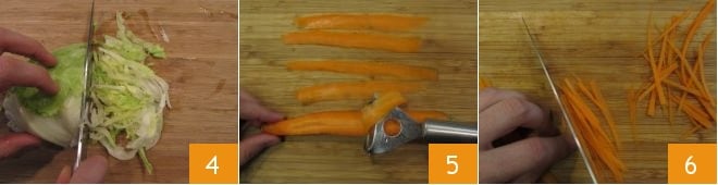 Meanwhile, prepare the vegetables: wash the iceberg lettuce and cut it into strips 4. Wash and peel the carrots 5, then julienne them 6.