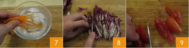 Submerge the carrots in ice water 7, this will make them curl. Wash and cut the radicchio into strips 8. Lastly, wash and quarter the cherry tomatoes 9.