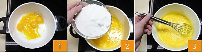 To prepare the Parisian flan, first prepare the cream for the filling: place the 5 egg yolks in a saucepan 1 and add the granulated sugar 2. Melt the sugar well over very low heat, stirring with a whisk 3.