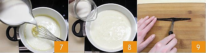 At this point, add the room-temperature milk in a thin stream, always stirring with a whisk 7 and the cream 8. Slit a vanilla bean lengthwise and scrape off the seeds with the tip of a knife 9.