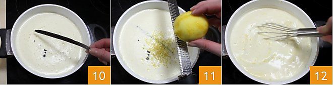 Add the bean and its seeds to the egg and milk mixture 10 and finally grate the zest of half a lemon 11; let it cook over low heat, stirring constantly with a whisk 12, for about 15 minutes or until it reaches a creamy and compact consistency, similar to that of custard.