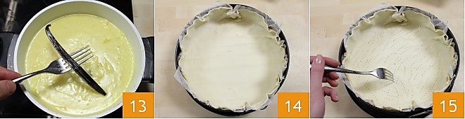 Once ready, remove the vanilla bean from the cream 13. Take the roll of puff pastry, which must be well chilled from the refrigerator, unroll it, and lay it, with its parchment paper, in a springform pan about 9.5 inches in diameter 14, then prick the bottom with a fork 15 so that the puff pastry does not puff up too much during cooking.