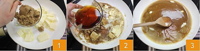 To prepare the flapjack, put the butter cut into pieces, brown sugar 1, salt, and golden syrup 2 in a large pan and heat everything over low heat (without bringing to a boil), stirring with a spoon 3, until the sugar is completely dissolved. Once you have a mixture with an amber color and fairly liquid consistency, turn off the heat and let it cool. If you can't find golden syrup, you can use the same amount of maple syrup or acacia honey, although the result will not be optimal.