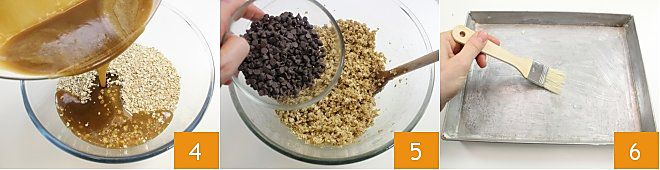 In a large bowl, pour the oat flakes and add the syrup mixture prepared earlier 4. Mix well so that the oat flakes absorb the syrup, resulting in a moist and sticky mixture. Finally, add the chocolate chips 5. Now prepare the tray: take a rectangular tray measuring 8 inches wide x 12 inches long and 1 inch in height, butter the bottom and sides using a kitchen brush 6 or simply with your hands (in this way the parchment paper will adhere better).