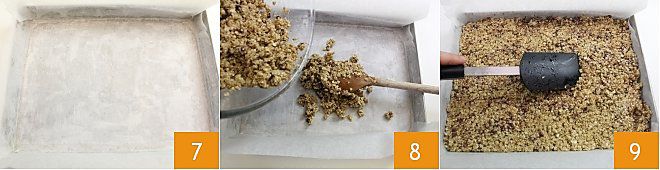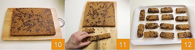 When the surface is golden brown, remove the pan from the oven, let it cool for 15-20 minutes, then remove the mixture from the pan, place it on a cutting board 10, and cut it into rectangles of 2.75 inches x 1 inch (11-12). The flapjacks are ready to be enjoyed!